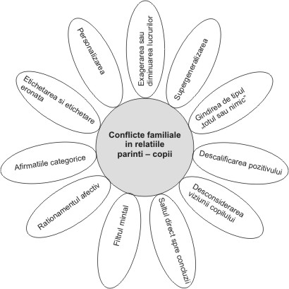În acest scop le putem propune parintilor un joc intelectual, numit „floarea conflictelor familiale”, unde fiecare petala reprezinta o structura de gîndire distorsionata. Întelegerea si constientizarea fiecarei structuri de acest tip presupune „smulgerea”, anularea petalei respective.