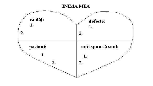 Fiecare elev va primi o fisa de lucru impartita in 4 sectiuni. In prima sectiune trebuie sa noteze 2 calitati, in cea de-a doua 2 defecte, in sectiunea a treia 2 pasiuni si in cea de-a patra 2 lucruri pe care la spun oamenii despre ei.