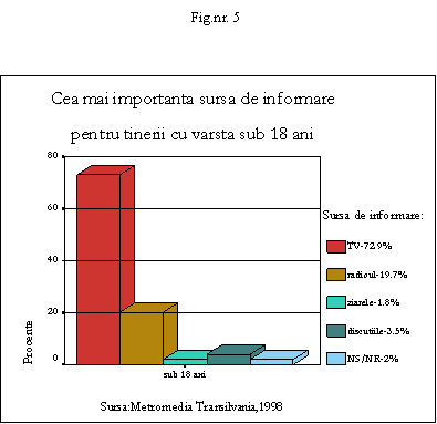 Oamenii asimileaza in timpul liber, dar nu numai atunci, informatii deosebit de eterogene, transmise de catre mass-media. Cercetarile sociologice au constatat, in cazul copiilor si adolescentilor, o larga deschidere spre aceste surse de cunoastere(vezi figura 5). Ceea ce stiu despre lume copiii, sustine Claude-Jean Bertrand(2001), stiu datorita scolii si mass-media. Dintre mijloacele comunicarii de masa, televiziunea se distinge prin pozitia pe care o ocupa in topul preferintelor, fapt pentru care ea este considerata "cea mai importanta sursa de naratiuni a societatii de masa"(Denis McQuail, Sven Windahl, 2001), ce eclipseaza institutii traditionale de socializare, precum familia, biserica si chiar comunitatea. Dintre subiectii chestionati de Metromedia Transilvania(1996-1997), cu varsta sub 18 ani, 72,9% considera televiziunea ca fiind cea mai importanta sursa de informare, 19,7% radioul, 1,8% ziarele, 3,5% discutiile, 2% nu stiu/nu raspund(cf.Vasile Dancu, 1998).