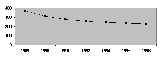 Graficul de mai jos reda rata anuala a natalitatii intre 1989 si 1996 (sursa: Education System in Romania, Ministry of National Education, Institute of Education Science, 1998).