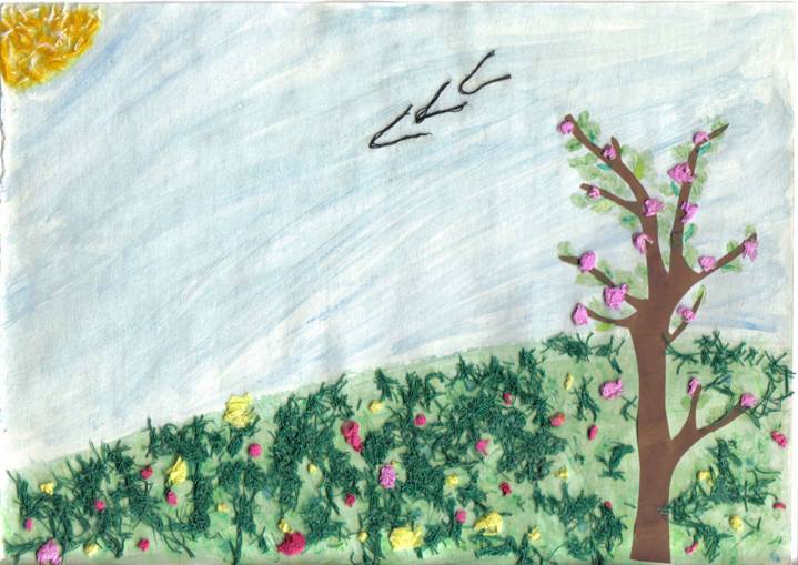 Conduce discutia cu privire la notimpul in care ne aflam. Invita elevii sa-si reaminteasca cateva cantece de primavara. Spune elevilor subiectul lectiei:"Primavara-colaj". Imparte clasa pe echipe de lucru si specifica faptul ca ora se va desfasura sub forma unui concurs. Echipele cele mai bune vor fi apreciate de catre un juriu, ce va acorda locurile I, II si III in acest concurs. Explica tehnica de lucru: -pe langa acuarele, vor folosi diverse materiale: hartie creponata, hartie glasse,fire |