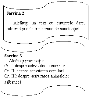 Material didactic: plansa reprezentand un pom in anotimpul toamna cu: pasari, fructe, frunze, cos pentru recoltarea fructelor; plicuri cu cartonase pentru alcatuiri de propozitii; plansa cu cele trei semne de punctuatie; cutii pentru fiecare grupa cuprinzand emblema acestora; fisa de lucru