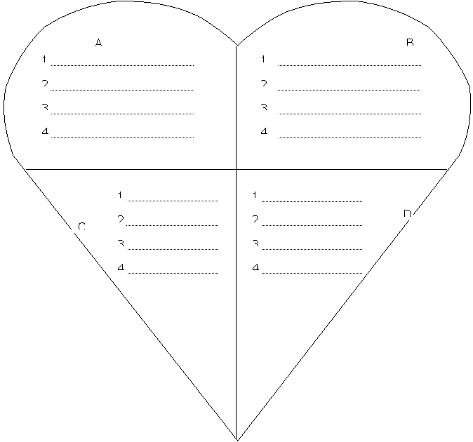 - profesorul imparte elevilor fisa de lucru nr.1(Harta Inimii) cerandu-le sa realizeze cerintele indicate pe fisa de lucru (fiecare elev primeste o foaie pe care este desenata o inima ce cuprinde patru zone numerotate cu A, B, C, D. Elevii vor trebui sa completeze cele 4 zone in modul urmator: