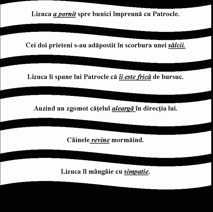 Prezint portretul lui Mihail Sadoveanu si cateva dintre volumele scrise de autor recomandandu-le elevilor lectura lor. Solicit citirea lectiei in gand si identificarea (sublinierea) cuvintelor necunoscute. Propun citirea lectiei pe fragmente, explicarea cuvintelor subliniate si introducerea lor in enunturi proprii (scorbura, rachita, bursuc, dispret). Adresez elevilor intrebari legate de continutul lectiei. Solicit citirea in lant a fragmentului. Propun elevilor asocierea personajului/obiectului cu actiunea sau descrierea lui (Anexa 1). Cer elevilor sa citeasca propozitii date, sa le ordoneze conform desfasurarii actiunii, apoi sa inlocuiasca cuvintele subliniate cu altele cu acelasi inteles (Anexa 2). Propun citirea selectiva a textului: Ø Propozitia care arata locul unde se afla Lizuca si Patrocle; Ø Propozitia prin care Lizuca isi exprima increderea fata de Patrocle; Ø Fragmentele ilustrate prin secventele de film vizionate.(fragmentele 1 si 2) |
