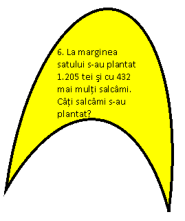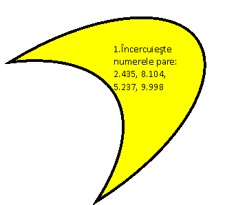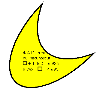 Calcul mintal - "Salveaz-o pe Alba ca Zapada " (ANEXA 2) Cum se numesc numerele care se aduna? (termeni) Cum se numeste rezultatul adunarii? (suma sau total) Cum se numeste primul numar la scadere, dar al doilea numar? (descazut, scazator) Cum se numeste rezultatul scaderii? (diferenta) Se calculeaza pe caiete exercitiile de adunare si scadere in intervalul 1.000 - 10.000 de pe plansa "La vanatoare". (ANEXA 3) Metoda didactica "Floare de nufar" Se prezinta o plansa pe care se afla desenata o floare de nufar. Pe fiecare petala exista cate o sarcina matematica. Exercitiile se vor lucra pe tabla si pe caiete. (ANEXA 4) |