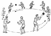 Capitanul sta in fata fiecarui sir de elevi. Elevul care a aruncat mingea, o recupereaza, o paseaza urmatorului elev si se deplaseaza la sfarsitul sirului. Voi lucra cu trei echipe.