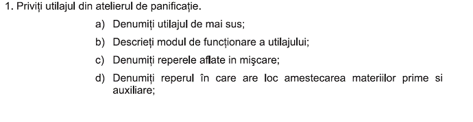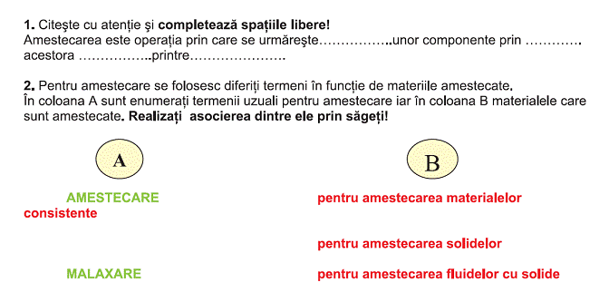m.s dirijeaza pe baza planului adresarea intrebarilor si receptarea raspunsurilor 1.Enumerati operatiile invatate pana acum. 2.Precizati necesitatea operatiei tehnologice de amestecare. 4.Precizati utilajele folosite pentru amestecare. |