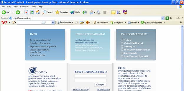 Cea mai simpla si ieftina metoda de utilizare a postei electronice este server-ul de e-mail gratuit. De exemplu : www.yahoo.com, www.hotmail.com, www.k.ro, www.go.ro, www.home.ro , www.email.ro, etc.