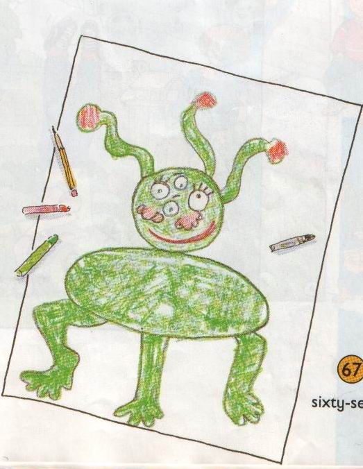 Parle avec ton copain. C'est mon monstre. Il s'appelle Zog. Il est vert et rouge. Il a quatre yeux et deux nez. Il a trois pieds. Il n'a pas de mains. Il a mal à la tête.