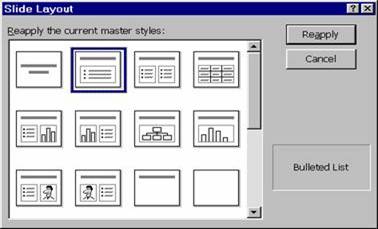Stilul diapozitivului curent se poate modifica din meniul Format cu optiunea Slide Layout, aleasa din meniul principal Format, sau activata cu butonul Slide Layout . Aspectul dorit (titlu, titlu&text, titlu& grafic, titlu & doua coloane ptr.continut etc.) se alege din fereastra SlideLayout ,vezi fig. nr 3)