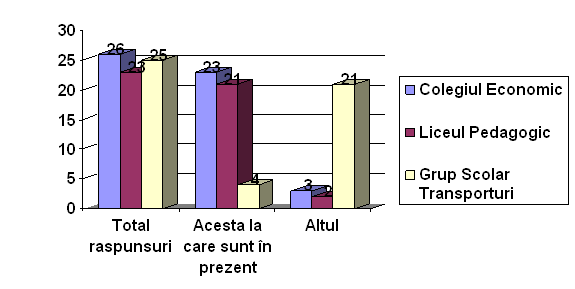 La capitolul alte raspunsuri Economic a fost catalogat cu un liceu cu elevi din mediul rural, Pedagogicul a fost catalogat ca "liceu de fete" iar Transporturi ca liceu "de smecheri". Observati ce impact are etichetarea asupra elevilor. Din nou trebuie adusa in discutie maniera ironica cu care au tratat intrebarea elevii din Transporturi (4 dintre ei au considerat ca este un liceu bun).