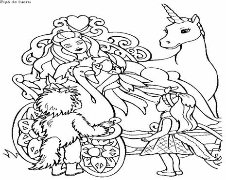 4. Colorati desenul de mai sus folosind aceste culori. Fiecare copil din grup sa-si aleaga cate un element al desenului:(printesa. unicornul, vulpita, lebada, fetita, trasura).
