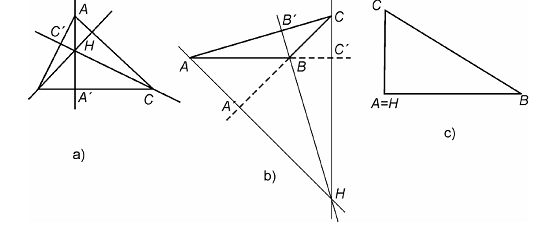 In figura c), triunghiul ABC este dreptunghic (in A) si ortocentrul H coincide cu A.
