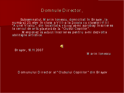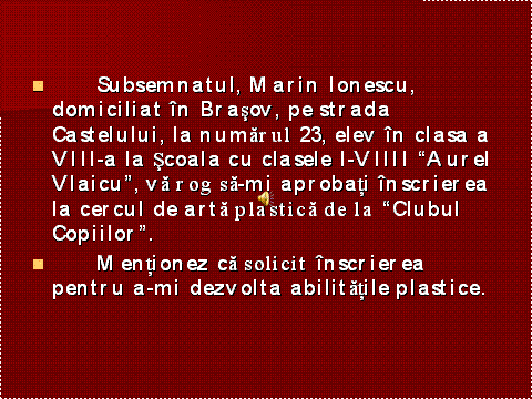 CERINTA:Elevii vor redacta in echipa o cerere , conform cerintelor din anexa 4. Dupa redactarea textelor, se va organiza Turul Galeriei, elevii isi vor expune lucrarile in fata clasei si vor face , dupa prezentarea lor de catre responsabilul grupei, aprecieri asupra lucrarilor proprii si ale celorlalte grupe. |