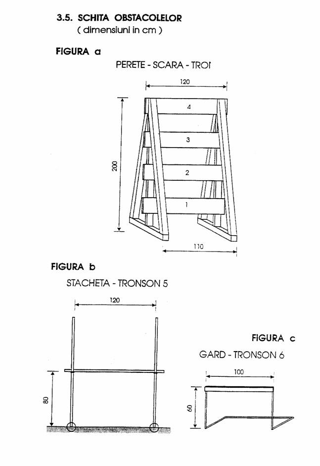 Tronsonul 5: concurentul nr. 5 trebuie sa treaca pe sub obstacol fara sa darame stacheta (vezi schita). Daca stacheta cade, el poate sa o repuna pe suport si sa reia proba.