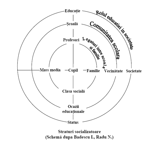 Sistemul educational are rolul de a socializa oamenii, astfel incat sa devina membri ai societatii, sa indeplineasca roluri semnificative in reteaua complexa a interactiunilor sociale. Prin invatarea rolurilor sociale care ii revin, copilul se socializeaza, adica deprinde cum sa satisfaca asteptarile celorlalti in legatura cu el. Pe masura ce rolurile sociale pentru care urma sa fie pregatit copilul s-au diversificat si au crescut in complexitate, ca urmare a evolutiei societatii, sistemul de educatie si-a multiplicat straturile socializatoare si si-a extins instantele de socializare.