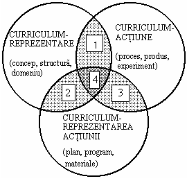 Curriculum-ul reprezinta cele trei ipostaze strans impletite, inseparabile formand un tot unitar.Aceasta unitate a triadei ipostaze curriculare este reprezentata grafic sub forma a trei cercuri intersectate, astfel in cat sa existe o zona comuna de intersectare a lor si un spatiu comun tuturor celor trei cercuri (ipostaze), ca in fig. nr.1.1.