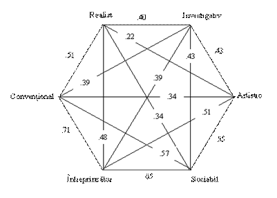 Relatiile intre tipurile de personalitate se presupune ca sunt invers proportionale cu distantele intre tipurile aratate in figura. Cu cat este mai mica distanta intre oricare doua tipuri, cu atat mai mare este similaritatea lor sau asemanarea psihologica. De exemplu, realistul si investigativul sunt prinse amandoua in figura; deci ele se aseamana una cu alta. In contrast, investigativul si intreprinzatorul sunt departe una de alta; deci sunt foarte diferite. Investigativul si socialul sunt la un grad intermediar de asemanare.