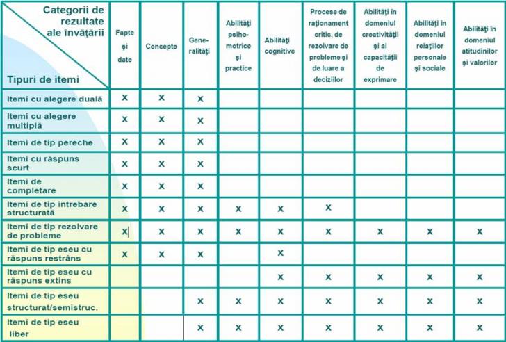 sarcini de lucru (itemi), care permit determinarea gradului de insusire a cunostintelor de catre elevi sau a nivelului de dezvoltare a unor capacitati pe baza de masuratori si aprecieri riguroase.