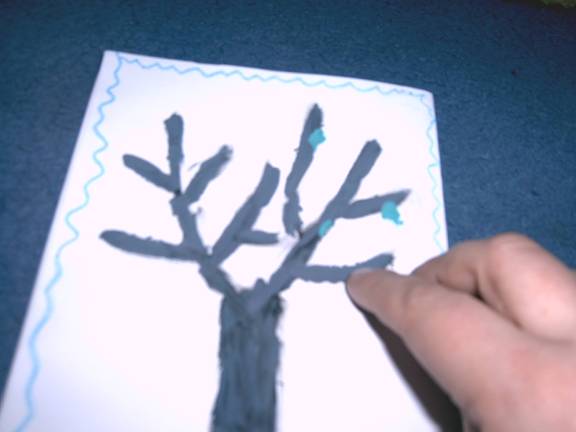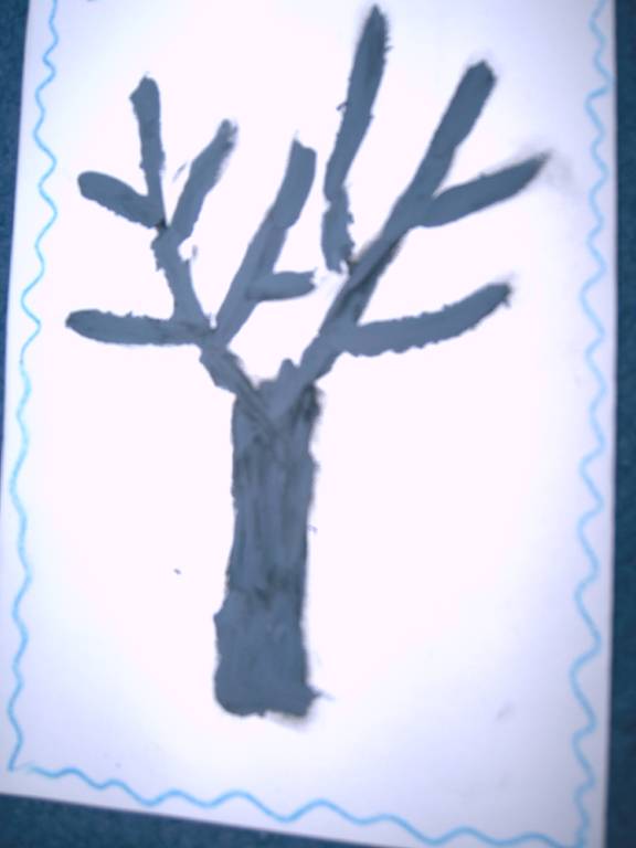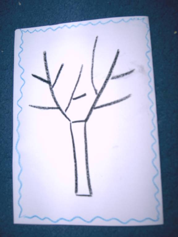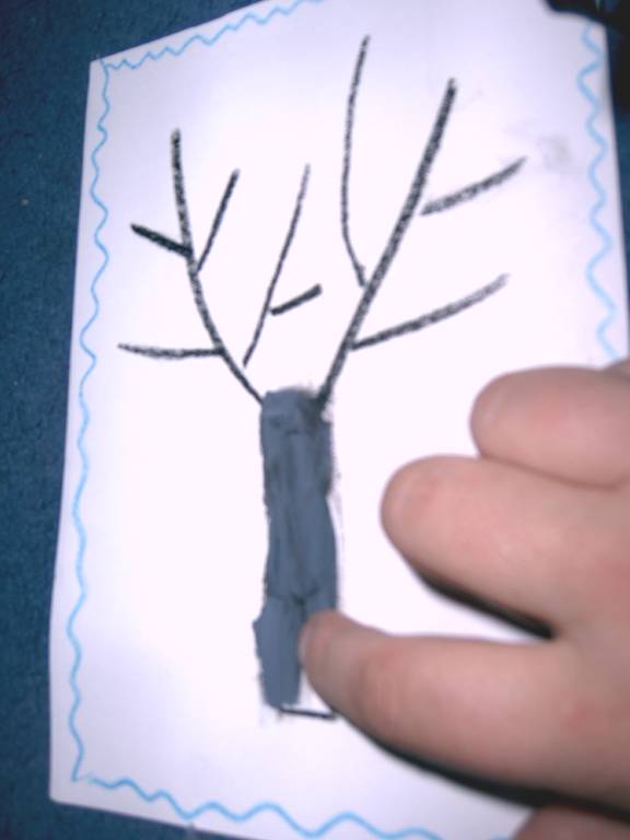 2.- se inmoaie foarte bine palstilina maro pentru trunchi si se intinde pe foaie cu degetul, acoperindu-se liniille(crengile +trunchi) desenate cu creionul
