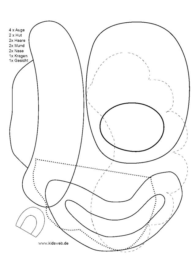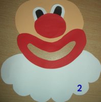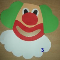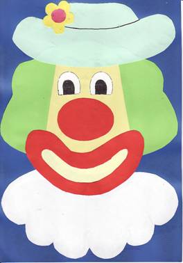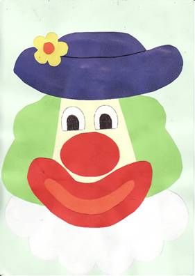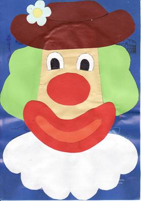 Decupati separat piesele (capul, ochii, palaria, peruca, gura, gulerul si nasul) pentru a obtine sabloane si conturati pe hartie colorata apoi aplicati partile componente pe coala alba A4 in ordinea indicata mai jos de imagini.