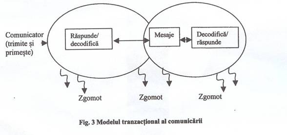 Modelul tranzactional al comunicarii, elaborat de R.B.Adler in 1991, transpune ideea ca mesajele pot fi emise si primite in mod simultan, comunicarea reunind imaginile emitatorului cu a receptorului. Decodarea si emiterea se produc in acelasi timp, partenerii comunicarii actionand simultan si adecvat reactiilor lor reciproce.