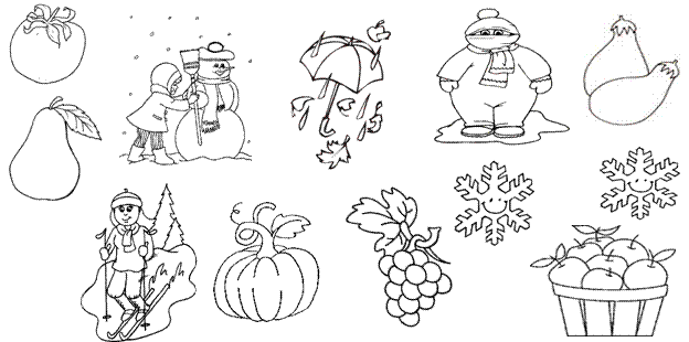 *Ce reprezinta fiecare desen? Coloreaza-le pe cele specifice toamnei, incercuieste desenele care apartin iernii.