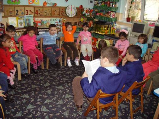 3. Toti copiii sunt adunati in semicerc, pe scaunele, sau pe covor, si educatoarea alege dintre copii un "presedinte", iar educatoarea devine "secretara" care noteaza tot. Presedintele ii invita pe copii la discutii: despre vreme, despre ce li s-a intamplat in ziua precedenta, sau ce au vazut sau auzit, despre o sugestie de tema facuta de educatoare. Pe rand, sunt adusi in centrul atentiei mai multi copii, pentru a povesti ceea ce li s-a intamplat. Copiii se simt importanti si responsabili pentru ca restul colegilor ii privesc si le pun intrebari, iar educatoarea noteaza gandurile lor.