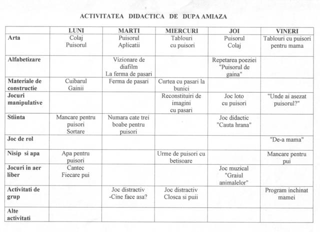 RESURSE UMANE :copiii si educatoarele de la grupa ; copiii si educatoarele de la alte grupe ;parintii ;specialistii ;ferma de pasari ; bunicii ; fratiorii ;