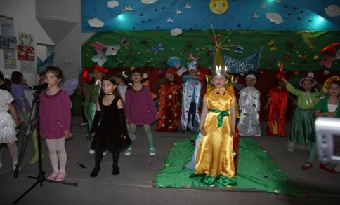 Se aude cantecul ,,Only Time,'' apare regina cu copiii -trena este dusa de copii costumati in copaci, flori, pisici, iepurasietc . Regina se aseaza pe tronul din centrul scene copiii danseaza in perechi . Pe negativ , povestitorul isi incepe povestirea