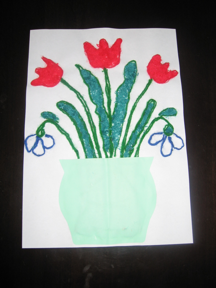 Lalele si ghiocei Materiale necesare: carton xerox color (suportul), fire PNA de diferite culori (rosu si albastru pentru flori, verde pentru tulpini si frunze), sablon pentru vaza, creCiteste tot ... 185 cuvinte