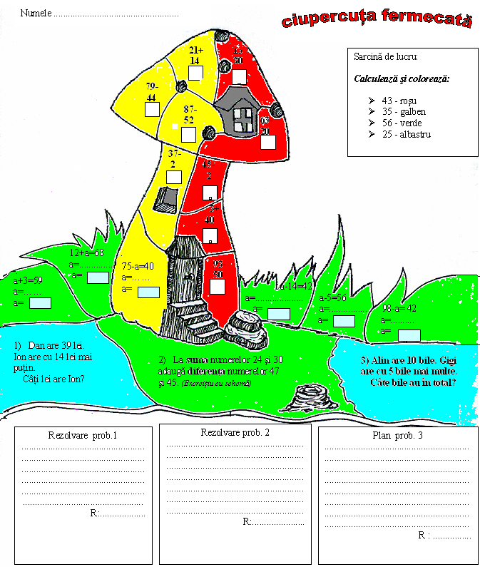 “CIUPERCUTA FERMECATA” EVALUARE LA MATEMATICA Clasa - I Aria curriculara - MATEMATICA SI STIINTE Obiectul - MATEMATICA Subiectul - ADUNAREA SI SCADEREA NUMERELOR 0 – 100Citeste tot ... 427 cuvinte