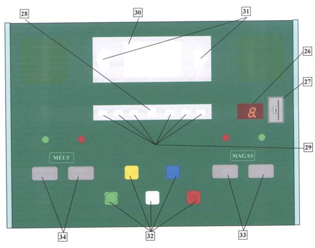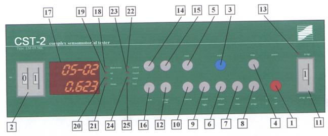 Pe tabloul de bord se gasesc LED-urile de identificare stim.error (18), sd. (19), rt. (20), mean (21) colour (22), sound (23), hand (24), foot (25), precum si display-ul pentru afisarea rezultatelor display (17).