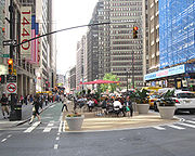 Broadway, as the name implies, is a wide avenue in New York City. While New York has several other Broadways, in the context of the city it usually refers to the Manhattan street. It is the oldest north-south main thoroughfare in the city, dating to the first New Amsterdam settlement. The name Broadway is an English translation of the Dutch name, Breede weg. A stretch of Broadway is famous as the pinnacle of the American theater industry.
