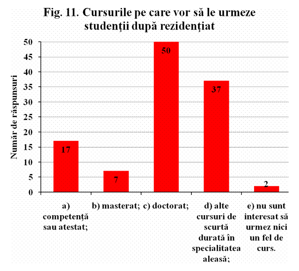 Studentii UMF, Bucuresti sunt constienti de nevoia unei pregatiri medicale temeinice, peste 2/3 dintre ei gasind ca benefica unificarea tematicii de examen pentru toate specializarile. In aceeasi proportie ei isi doresc sa se supraspecializeze sau sa urmeze programe de doctorat, masterat sau cpompetente.