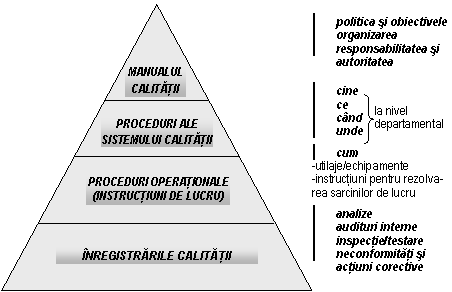 Sistemul calitatii definit ca ansamblu de "structuri organizatorice, proceduri, procese si resurse necesare pentru implementarea managementului calitatii" (SR ISO 8402), este un sistem bazat pe o documentatie specifica. Aceasta documentatie expune, intr-un cadru formal, baza tinerii sub control a activitatilor critice care afecteaza calitatea intr-o organizatie. El ar trebui sa reflecte felul in care opereaza organizatia.