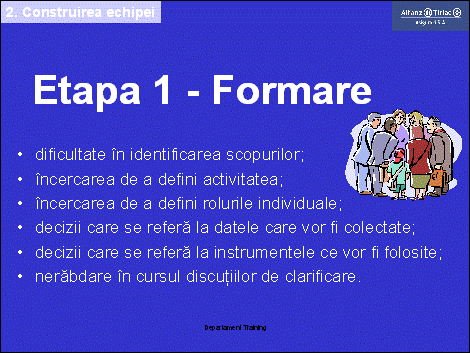 In etapa de formare se incearca identificarea scopurilor echipei, definirea activitatii si a rolurilor individuale, se iau decizii referitoare la instrumentele ce urmeaza a fi folosite in activitatea echipei.