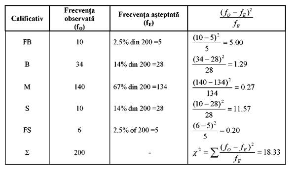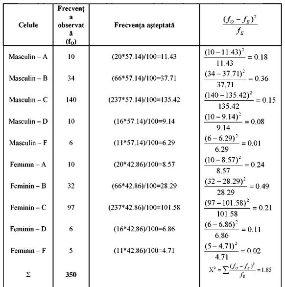 Asa cum constatam, intre frecventele observate si cele asteptate sunt diferente. Suma frecventelor asteptate (teoretice) este egala cu suma frecventelor observate (poate rezulta o anumita diferenta intre totaluri, ca urmare a aproximarii zecimalelor).