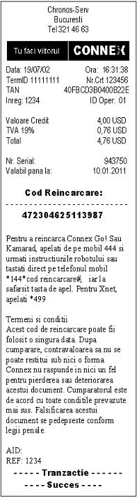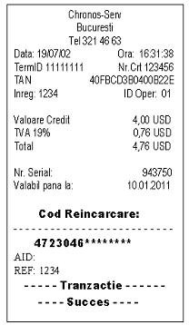 PASUL 7. Daca tranzactia a fost finalizata cu success terminalul tipareste pe rola sa de hartie termica voucherul clientului care contine codul de reincarnare pentru produsul care a fost tranzactionat impreuna cu celelalte informatii de identificare a tranzactiei cum ar fii data, ora, ID operator, TAN - numarul tranzactiei, etc. In imaginea urmatoare se prezinta un exemplu de voucher de 4 USD. Acest voucher care contine codul de reincarcare se inmaneaza clientului si se incaseaza contravaloarea valorii acestuia de la client.