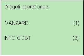 PASUL 1. Din meniul principal al terminalului (care a fost prezentat in prima parte a acestui manual) se apasa tasta "2" de pe tastatura POS-ului pentru a ajunge in meniul de INFO COST.
