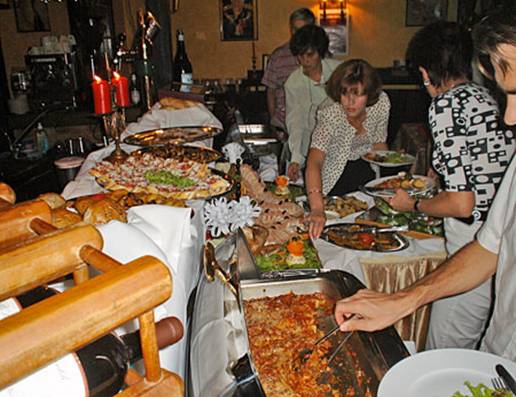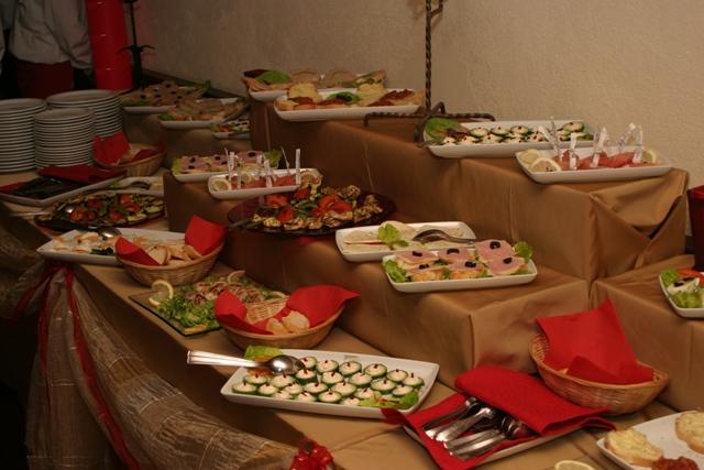 Ca sortimente de preparate, se recomanda gustari reci si calde sub forma de tartine, sandwichuri, salate de cruditati cu sosuri, specialitati culinare din peste, din fructe de mare, din subproduse de carne, deserturi diferite, toate montate cu un aspect placut in prezentare, pe platouri, cupe din sticla, asezate in lungimea mesei, pe mijloc.
