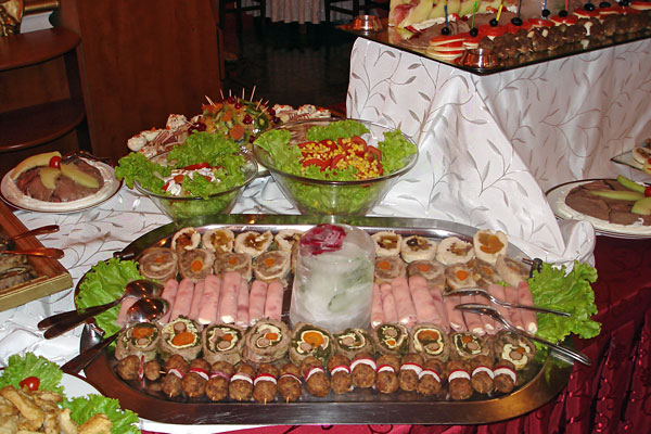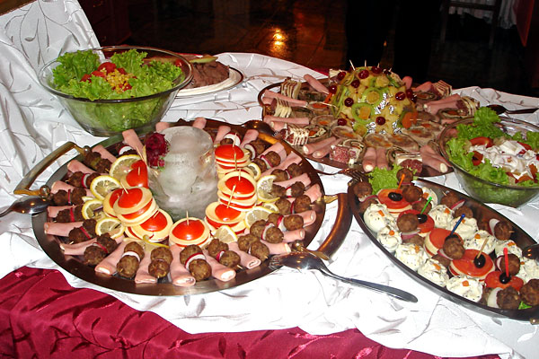 Meniurile pentru astfel de mese pot fi constituite din: tartine cu icre, salam, sunca, peste, branza, cascaval, pateu de ficat, sardele, ficasei de pasare, carnaciori, crochete, bulete, crenvusti, salata a la de vinete, rosii, ardei gras, castraveti, oua umplute etc;