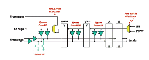 Pentru a reduce numarul ocolirilor logice, multiplexorul WDSEL a fost scindat: alegerea intre ALU si PC+4 este facuta la nivelul ALU, in timp ce alegerea intre ALU/PC si MEMDATA este facuta la nivelul WB.