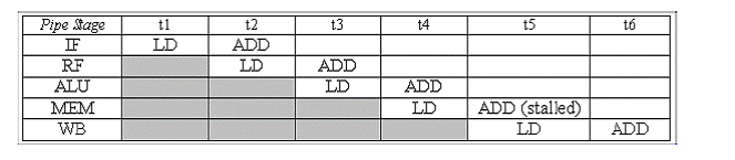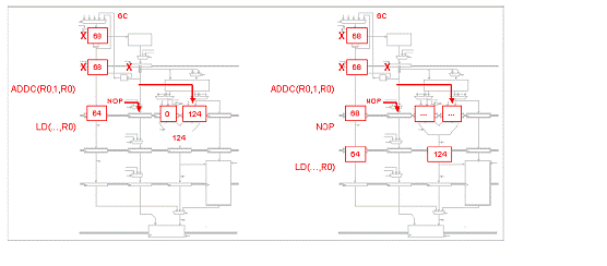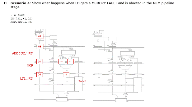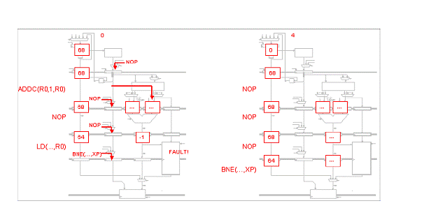 Daca are loc o eroare la nivelul MEM (ex: accesare ilegala a memoriei) , instructiunea curenta din stadiul ALU trebuie inlaturata, ceea ce hardware-ul face substituind NOP. De retinut este faptul ca o eroare la nivelul MEM inlatura toate instructiunile curente din IF, RF si ALU deoarece acestea se afla din punct de vedere logic dupa instructiunea ce a cauzat eroarea.