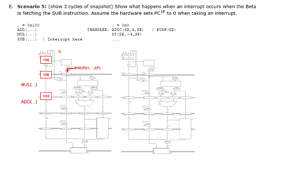 Aceasta problema face referire la intreruperile externe ale procesorului Beta, avand o structura de banda de asamblare cu 5 etaje, cu ocolire, si cu un canal de intarizere in cazul instruciunii Branch, cu anulare ( instructiunea din canalul de intarziere nu este executata). De luat in considerare este faptul ca daca o intrerupere externa are loc in ciclul I, atunci adresa rutinei de tratare a intreruperilor, XAdr, este incarcata in PC la sfarsitul ciclului I, iar instructiunea ce ocupa nivelul IF in timpul ciclului I, va fi inlocuita cu BNE (R31, XAdr, XP). Sa presupunem ca acestea ar fi primele linii ale unei rutine de tratare a intreruperilor: