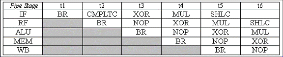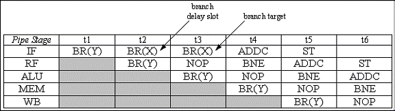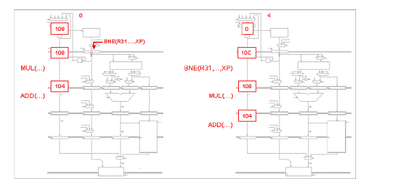 Prin interzicerea intreruperilor atunci cand se anuleaza canalul de intarziere in cazul instructiunii Branch (ciclul t2), valoarea PC+4 care se stocheaza in XP cand intreruperile sunt tratate (ciclul t3), este adresa celei de-a doua instructiuni dupa Branch, care, in cazul exemplului nostru, este instructiunea MUL. La revenirea din rutina de tratare a intreruperilor, XP va fi adaptata la adresa instructiunii XOR.