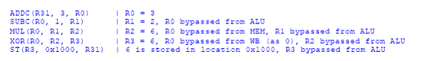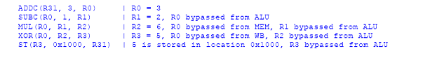 Rezultatul operatiei ADD trebuie propagat urmatoarei operatii de SUB; este nevoie de ocolire: de la outputul lui ALU in etapa ALU la operandul B in etapa RF.