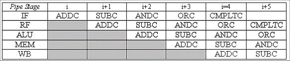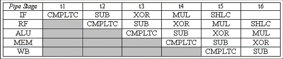 CMPLTC va fi prima instructiune care va lua noua valoare a lui R0. Toate Instructiunile anterioare folosesc valoarea precedenta a lui R0. Instructiunea ADDC este in stadiul WB, in timp ce ORC este in stadiul RF, deci noua valoare a lui R0 nu este scrisa la timp pentru ca ORC sa o citeasca.