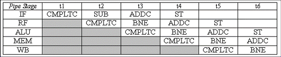Rezultatul operatiei ADD trebuie sa fie transmis instructiunii CMPLT, trei cicluri mai tarziu; este nevoie de ocolire: de la outputul ALU in etapa WB la operandul A in etapa RF.