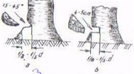 Daca tensiunea din arbore ar lasa catargul in jos a doua taietura 2 se executa mai devreme de cioata decat taietura 1 (fig 13).